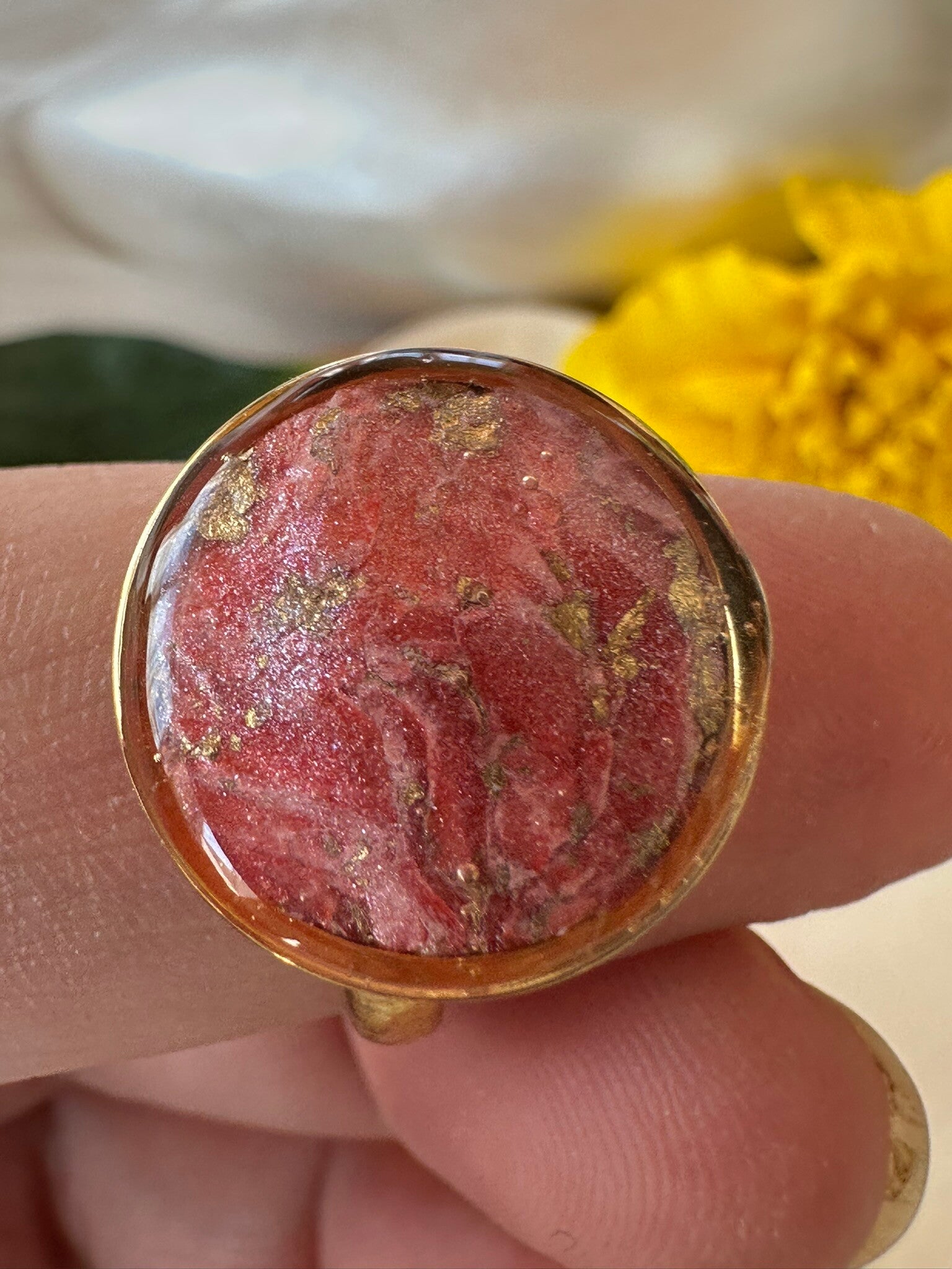 Dieser Ring wurde in sorgfältiger Handarbeit aus Polymer-Ton, mit Messing-oder Edelstahlfassungen gefertigt. Er ist sehr leicht und angenehm zu tragen und damit ein eleganter Akzent zu jedem Outfit.