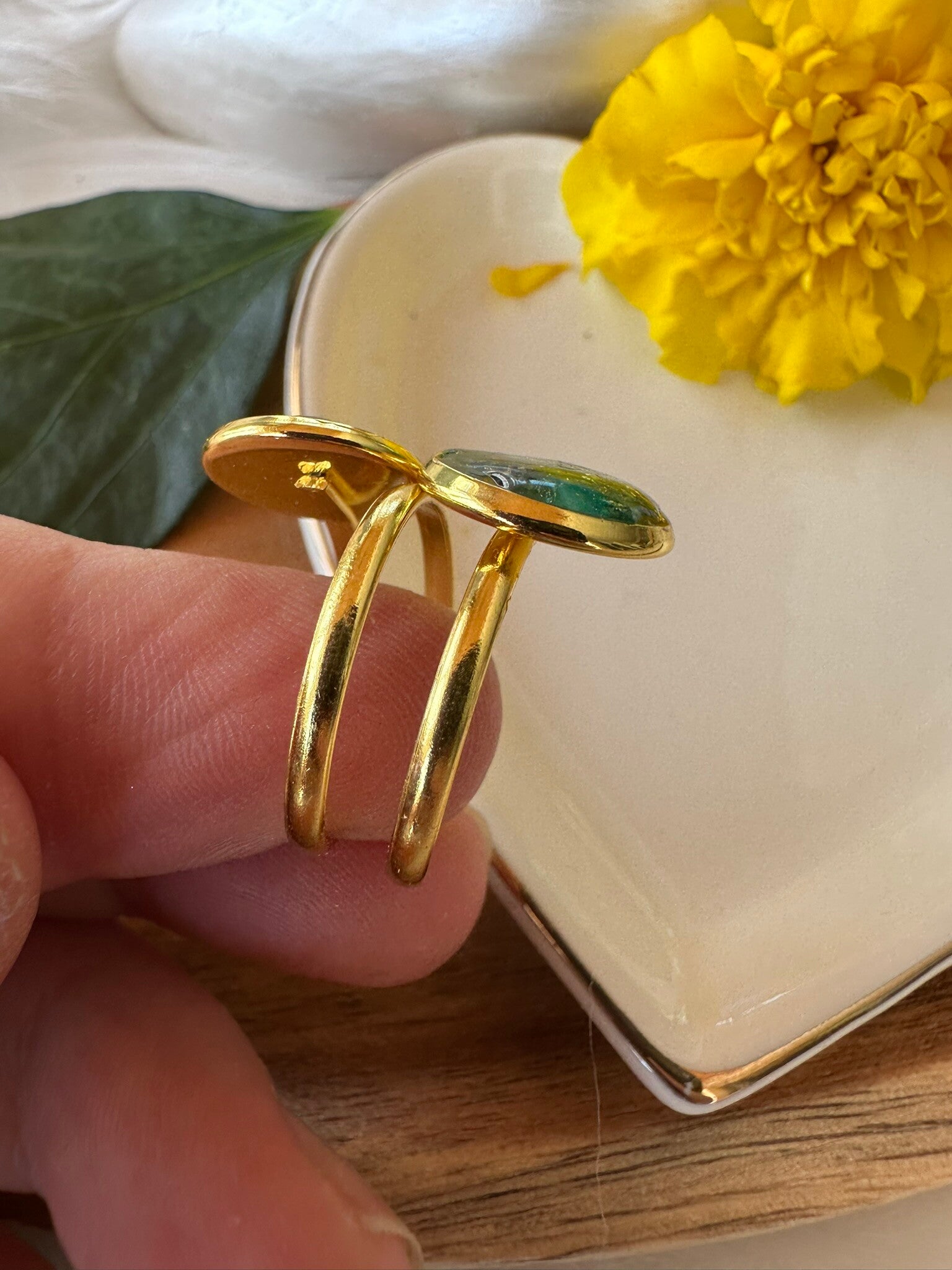 Dieser Ring wurde in sorgfältiger Handarbeit aus Polymer-Ton, mit Messing-oder Edelstahlfassungen gefertigt. Er ist sehr leicht und angenehm zu tragen und damit ein eleganter Akzent zu jedem Outfit.
