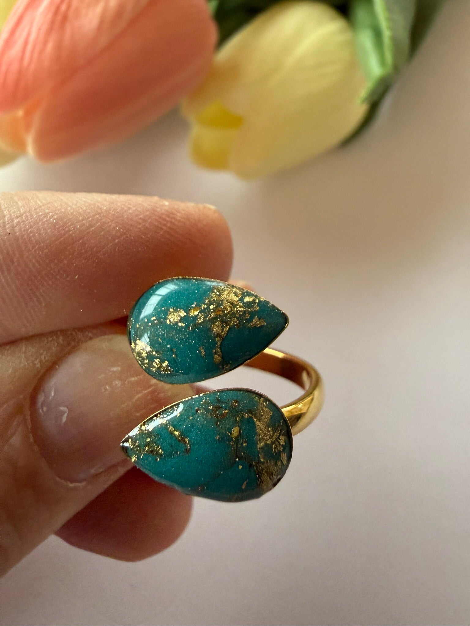 Dieser Ring wurde in sorgfältiger Handarbeit aus Polymer-Ton, mit Messing-oder Edelstahlfassungen gefertigt. Er ist sehr leicht und angenehm zu tragen und damit ein eleganter Akzent zu jedem Outfit.