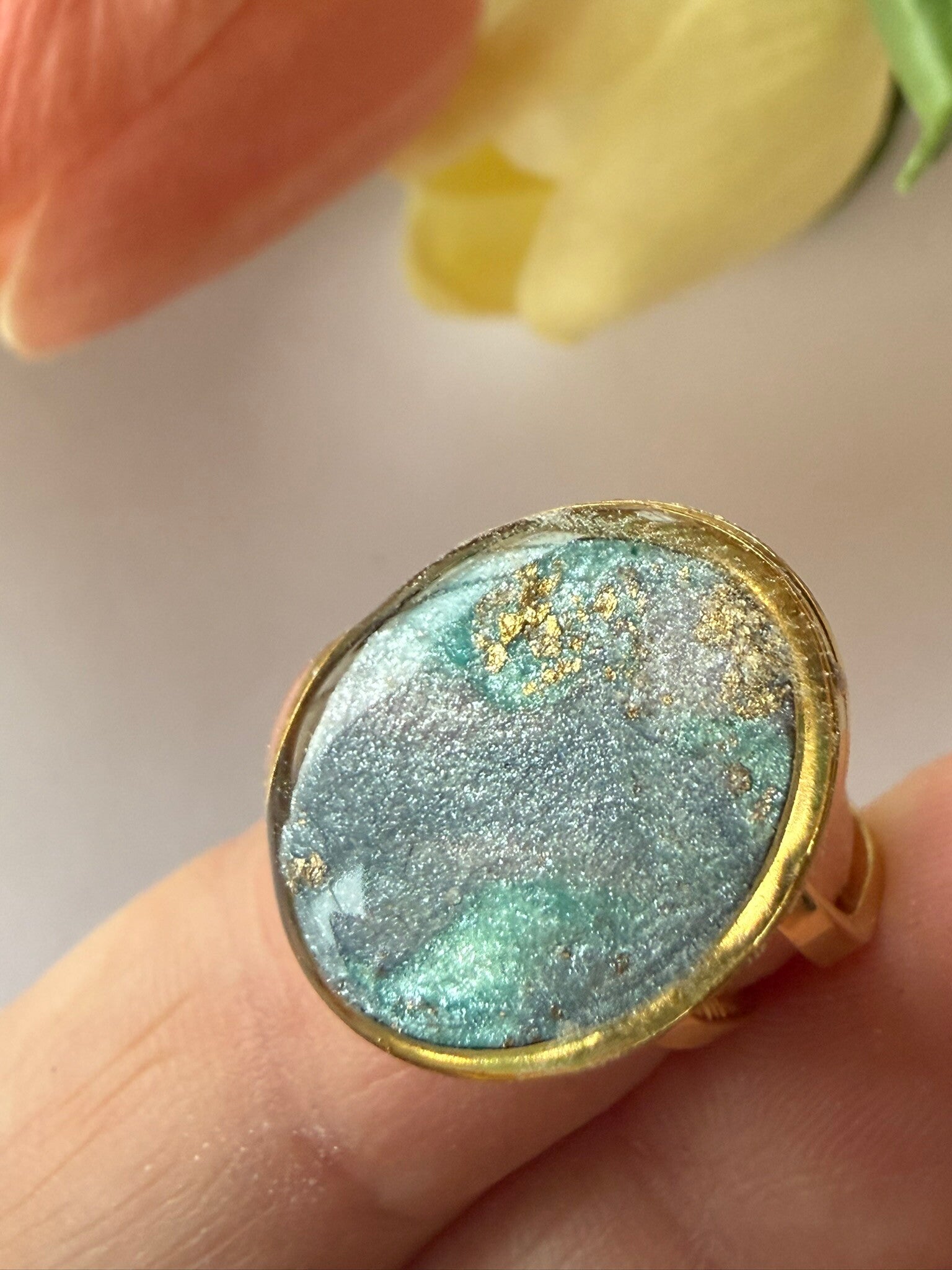 Dieser Ring wurde in sorgfältiger Handarbeit aus Polymer-Ton, mit Messing-oder Edelstahlfassungen gefertigt. Er ist sehr leicht und angenehm zu tragen und damit ein eleganter Akzent zu jedem Outfit.