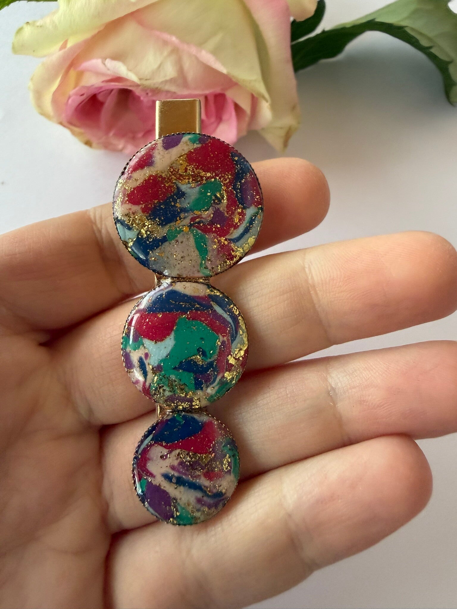 Dieser Haarschmuck wurde in sorgfältiger Handarbeit aus Polymer-Ton, mit Messing-oder Edelstahlfassungen gefertigt. Er ist sehr leicht und angenehm zu tragen und damit ein eleganter Akzent zu jedem Outfit.