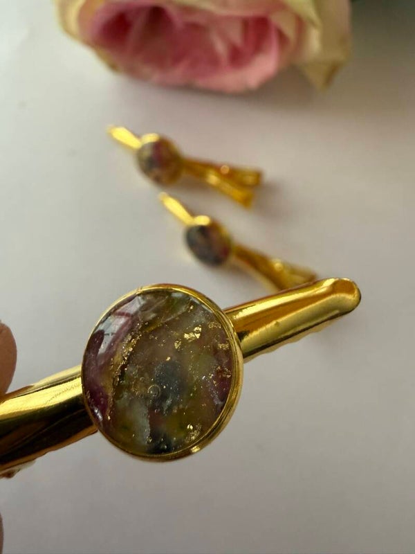 Dieser Haarschmuck wurde in sorgfältiger Handarbeit aus Polymer-Ton, mit Messing-oder Edelstahlfassungen gefertigt. Er ist sehr leicht und angenehm zu tragen und damit ein eleganter Akzent zu jedem Outfit.