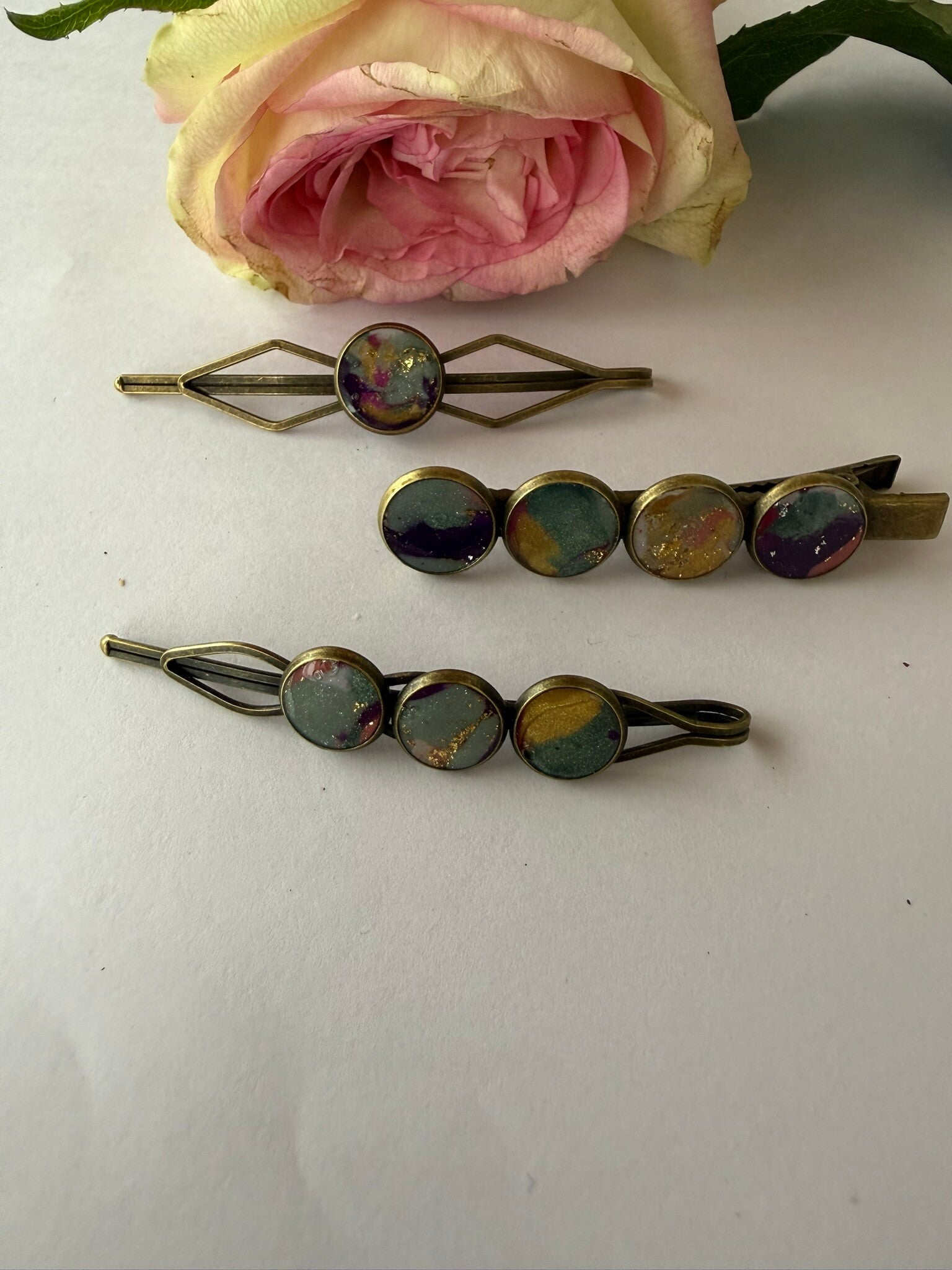 Dieser Haarschmuck wurde in sorgfältiger Handarbeit aus Polymer-Ton, mit Messing-oder Edelstahlfassungen gefertigt. Er ist sehr leicht und angenehm zu tragen und damit ein eleganter Akzent zu jedem Outfit.