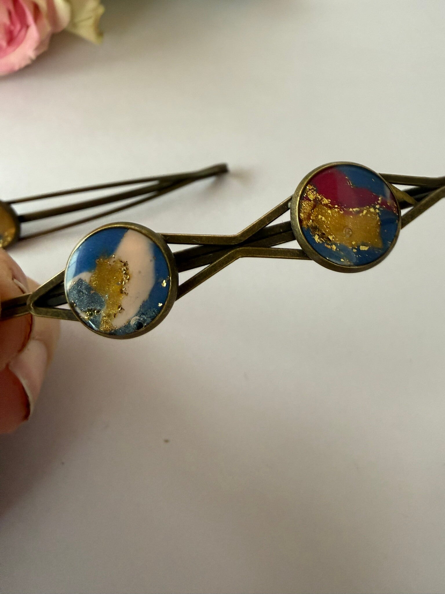 Dieser Haarschmuck wurde in sorgfältiger Handarbeit aus Polymer-Ton, mit Messing-oder Edelstahlfassungen gefertigt. Er ist sehr leicht und angenehm zu tragen und damit ein eleganter Akzent zu jedem Outfit.